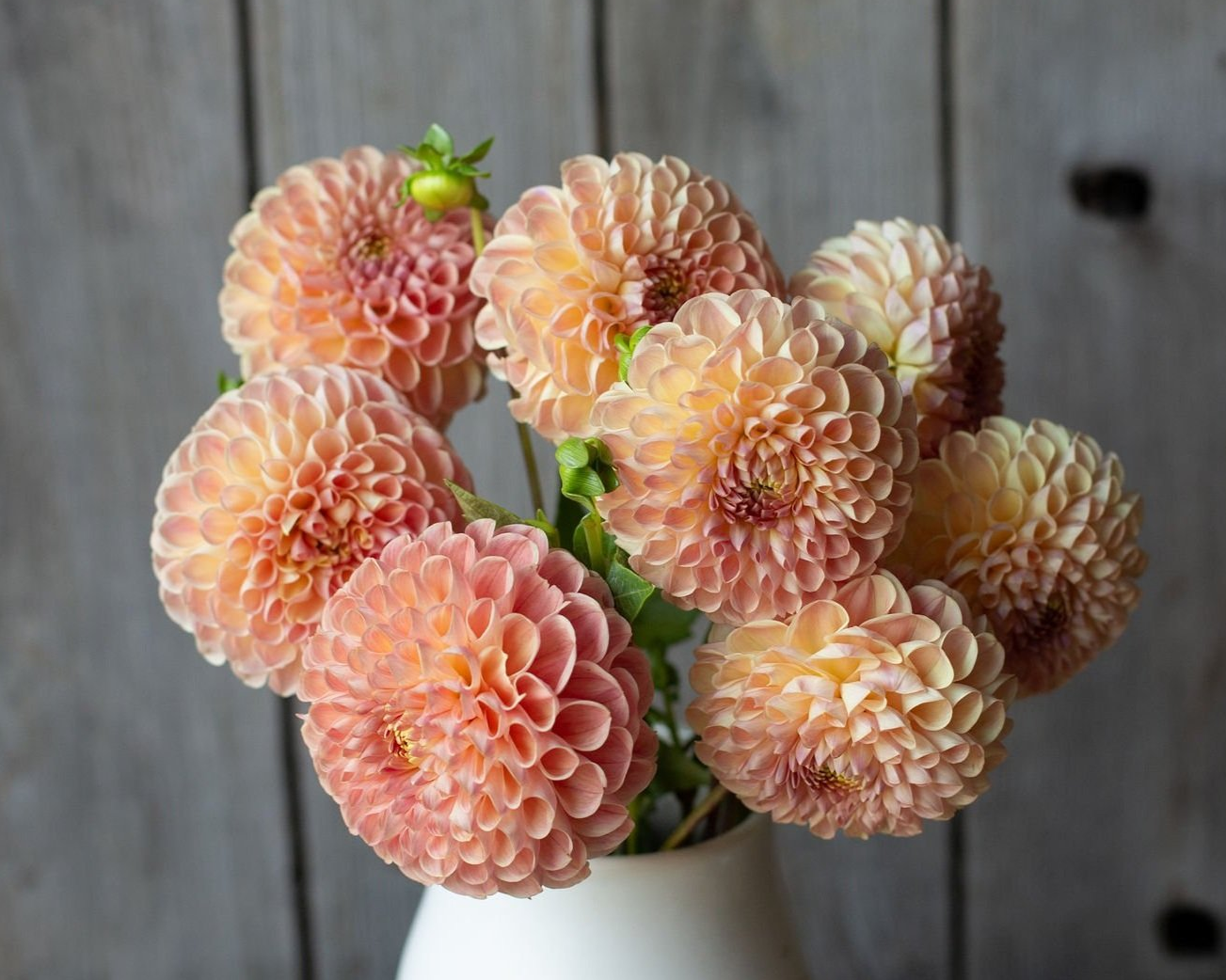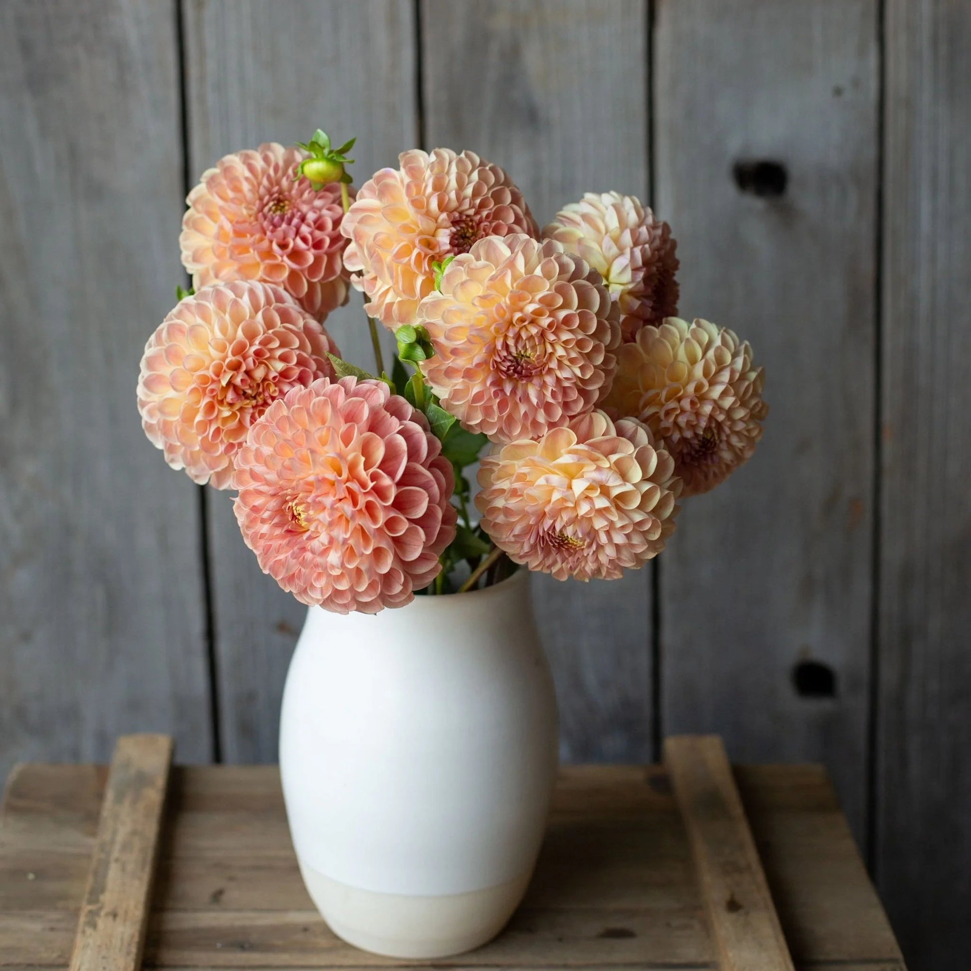 Perfectly muted peachy color, can often pass with light brown and nude color palette. She is my favorite for her color and distinctive 4-6” ball shaped blooms.