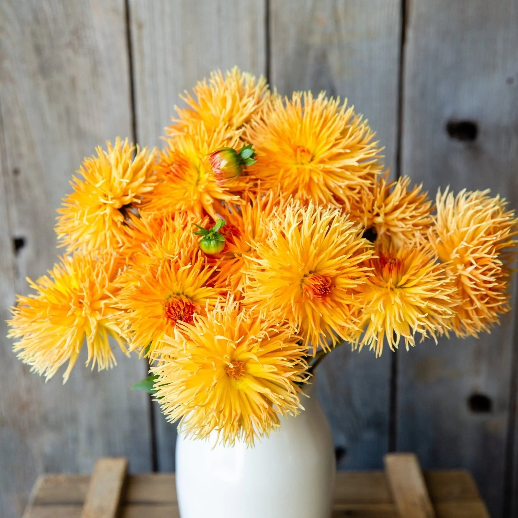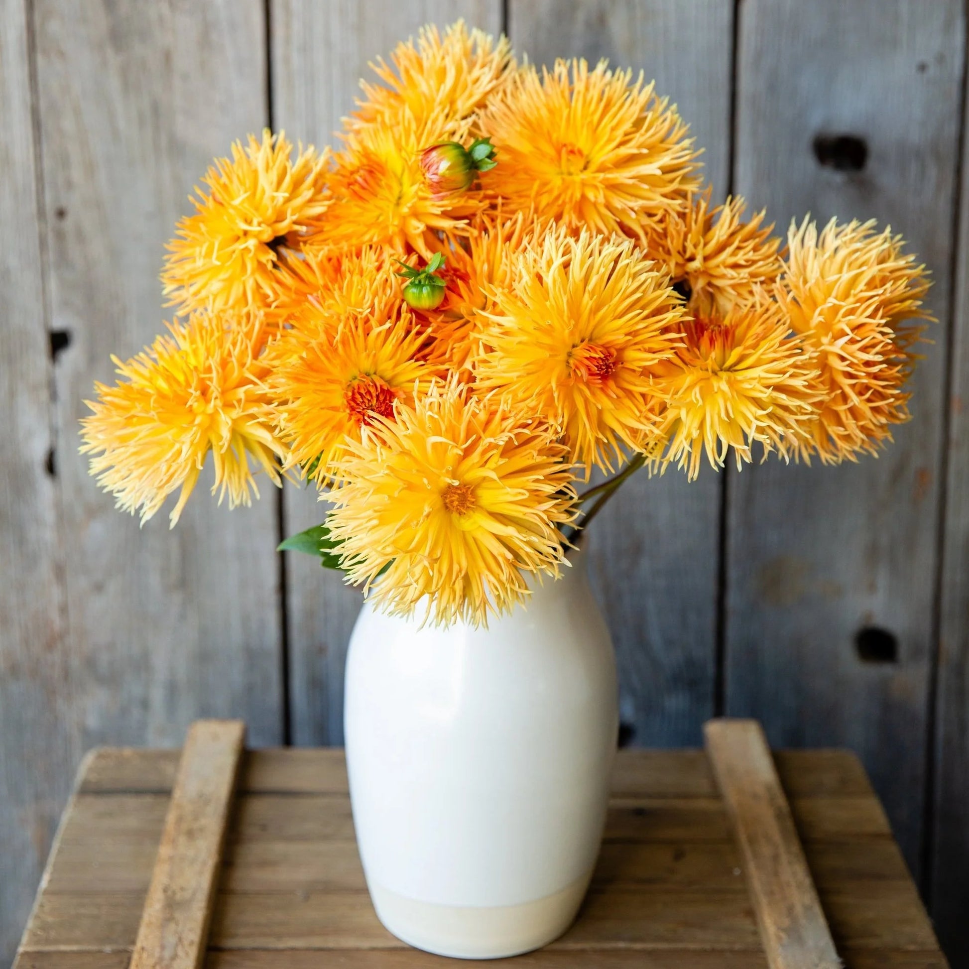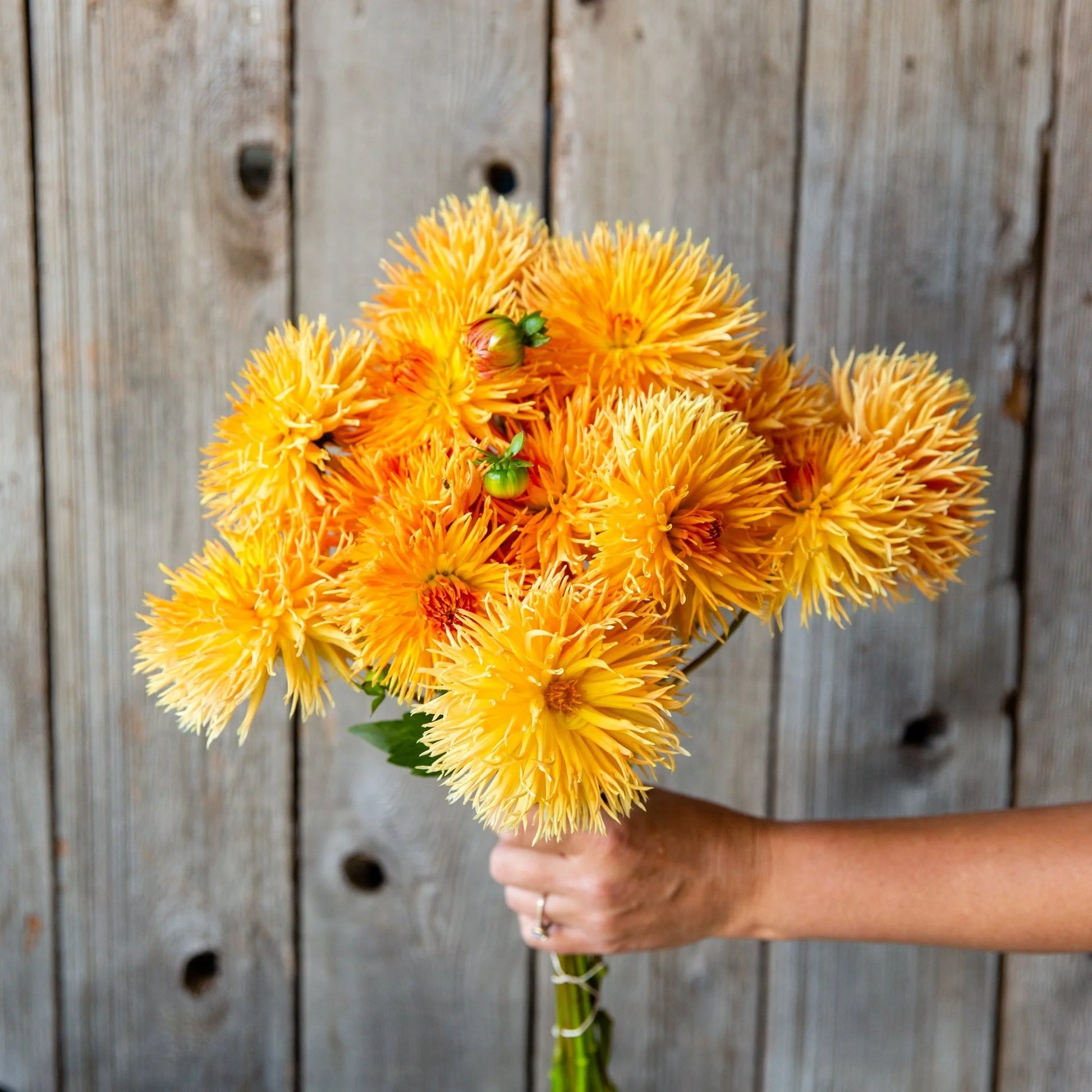Kaiwera Gold is a stunning dahlia variety showcasing a captivating gold hue accentuated by a warm amber center. This unique flower, originally cultivated in New Zealand, boasts a myriad of intricately laced petals, creating a mesmerizing display that is truly irresistible.